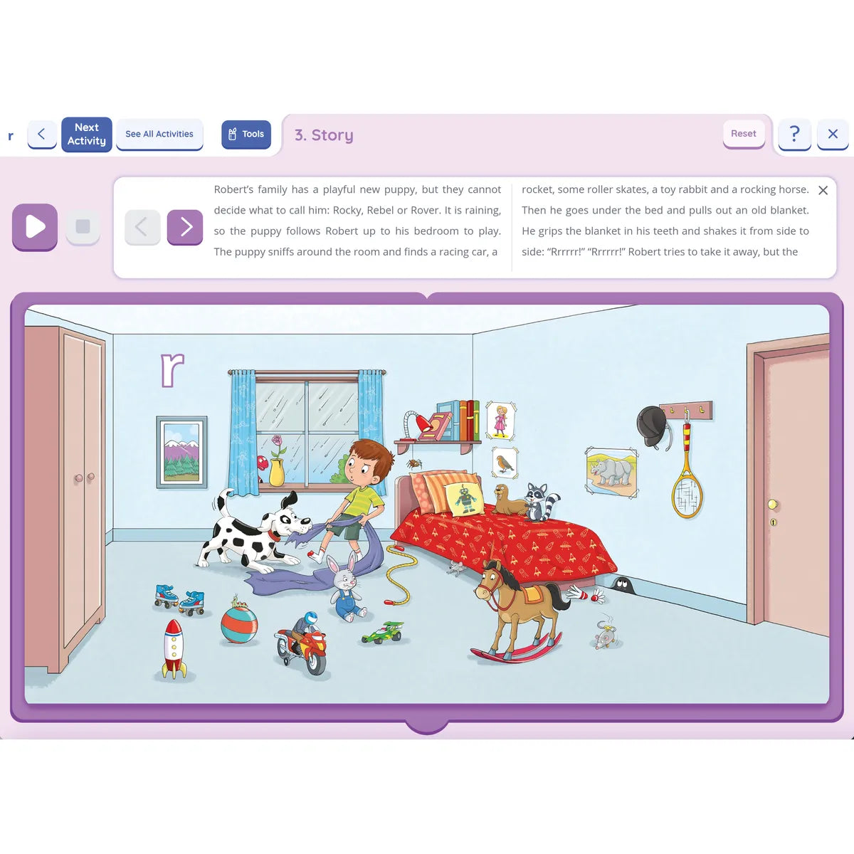 Inbuilt audio for the letter sounds, Jolly Songs and story option